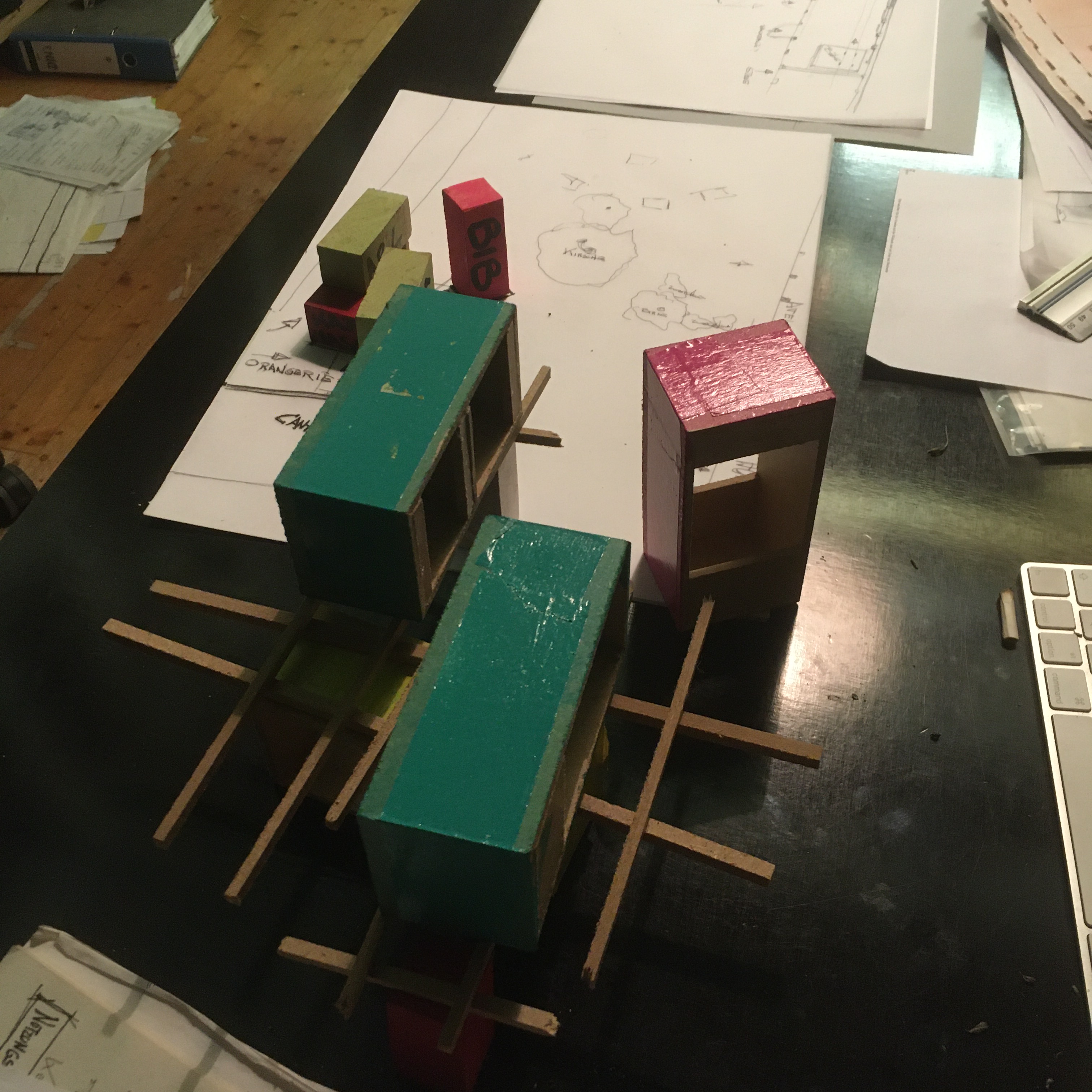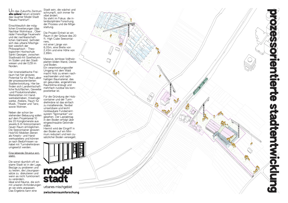 bis 20 Konglomerate aus jeweils 6-8 Holzcontainern neuen Raum ermöglichen. Die Seecontainer groszen Holz100 Mobilien dienen als Kreativ- und Hand- werksateliers und können je nach Bedürfnissen variabel mit Turmdrehkränen umgesetzt werden.